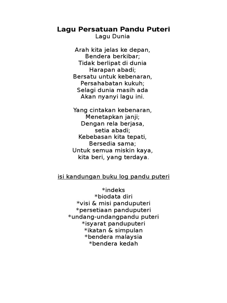 Klik untuk dengar lagu Pandu Puteri. PERSATUAN PANDU PUTERI MALAYSIA - LAGU DUNIA SEMPENA MAT PPPM PERLIS 2018. Ordinan Pandu Puteri 1953 telah.
